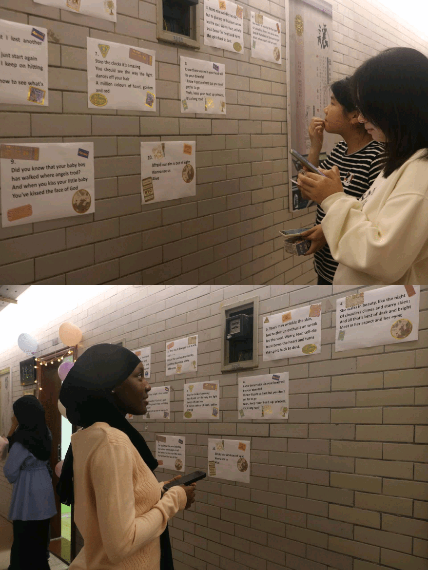 紧随其后的便是与你相“译”,同学们都聚精会神的翻译墙上的英文诗句,锻炼翻译能力的同时还能陶冶情操,让同学们能真切体会到英语的魅力,激起同学们学习英语的兴趣。翻译成功后还能进入集贤阁领取奖品。