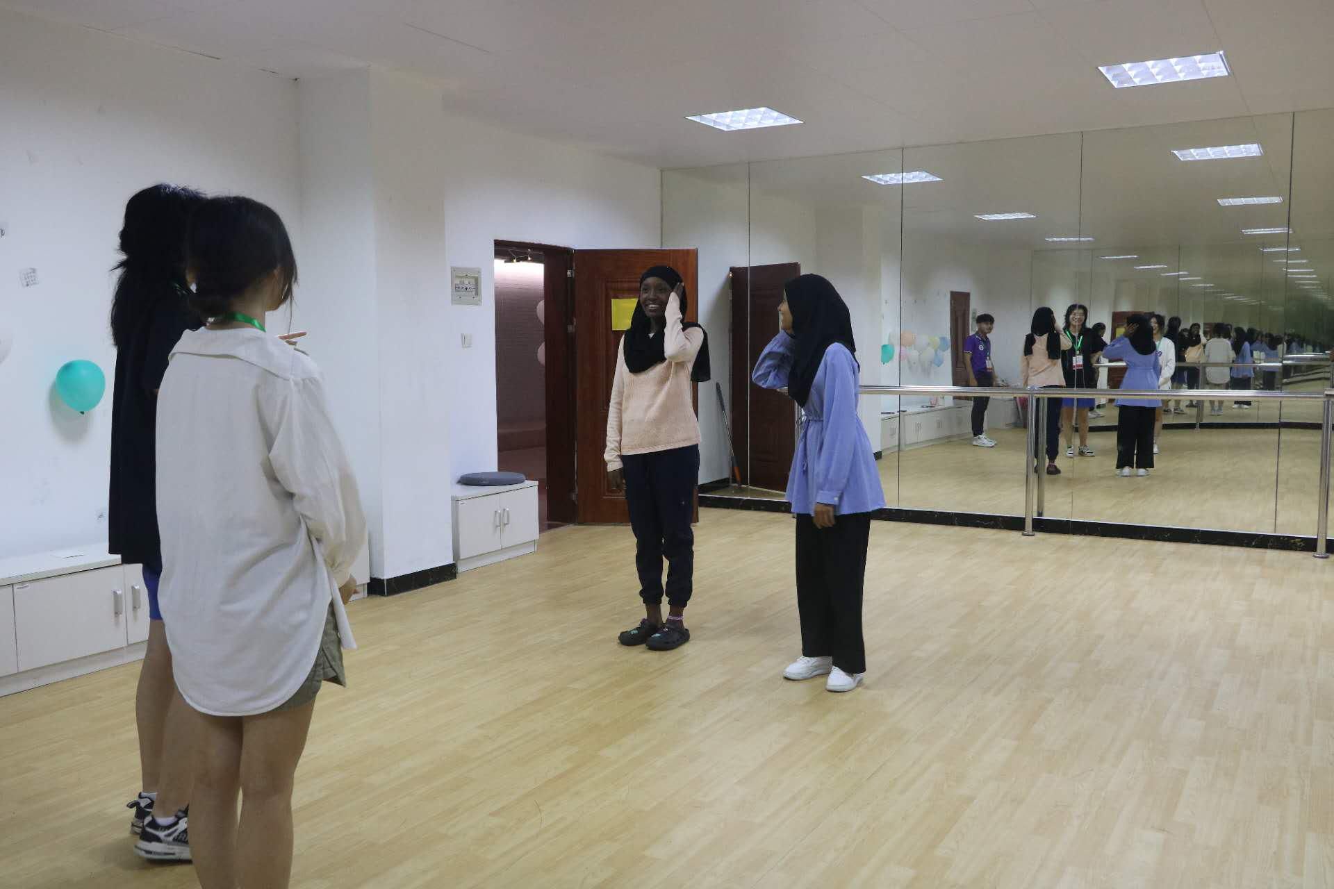再往前走就是正话反做了。艺馨轩内的同学们根据主持人的话进行动作变换,不过做的却是与主持人口中单词相反的动作,不仅考验同学们的反应能力还能将英语和肢体动作结合,帮助记忆单词的同时增添了许多乐趣,现场热闹非凡。