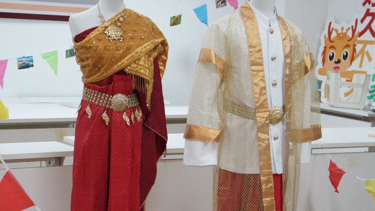 活动现场的服装区包括柬埔寨传统婚礼服装展示和柬埔寨裤子穿脱教学两部分。女装以红色和深金色为主,男装则以白色和红色为主,深金色为辅。漂亮的服饰吸引了不少同学驻足观赏。