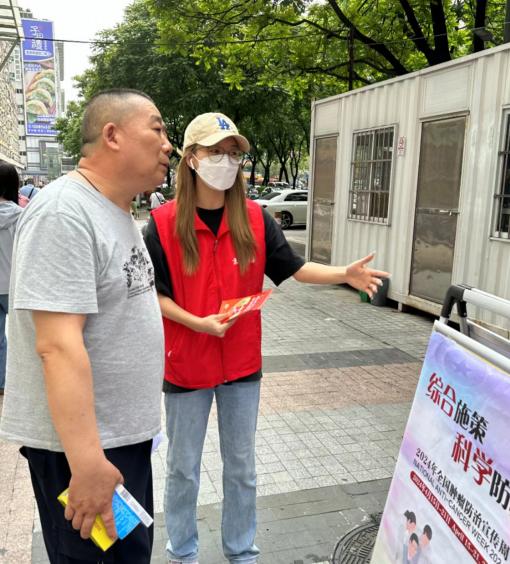 居民在志愿者的热情引导下,纷纷前往义诊服务咨询台进行登记。在活动现场,志愿者们各司其职,相互协调配合,与社区卫生工作人员一道,积极为居民进行健康科普知识和癌症筛查流程的讲解,并发放有关癌症医疗宣传单,引导居民有序排队进行大肠癌筛查、血压测量等健康检查免费服务。同时,面对越来越多来访居民,志愿者配合工作人员维持公共秩序,确保社区义诊服务活动顺利进行。