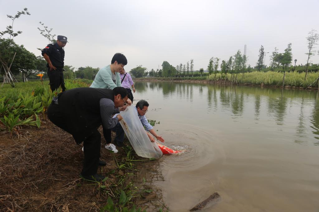 4月20日上午,顺德容桂总商会荣誉会长陈兆驹再为校区捐赠锦鲤鱼苗两万余尾,重量约10斤左右的成年锦鲤七十余尾。其中二十余尾已快速通过校车转交总务处集中投放于校本部办公楼前喷水池中,供校本部教职工欣赏,其余五十余尾已集中投放于顺德校区湿地公园,为园区增添了新的活力,与园区逐渐成林的景观带、中心岛上活泼可爱的黑山羊、大白鹅、青头鸭、小白兔等小动物们形成水陆呼应、动静相宜的特色景观,给师生及广大参观者创造了一个欣赏美景、感受生命的好去处,让校区更显优雅俊美、生机盎然,也让学生在紧张的学习之余能够更加懂得亲近自然、敬畏生命。