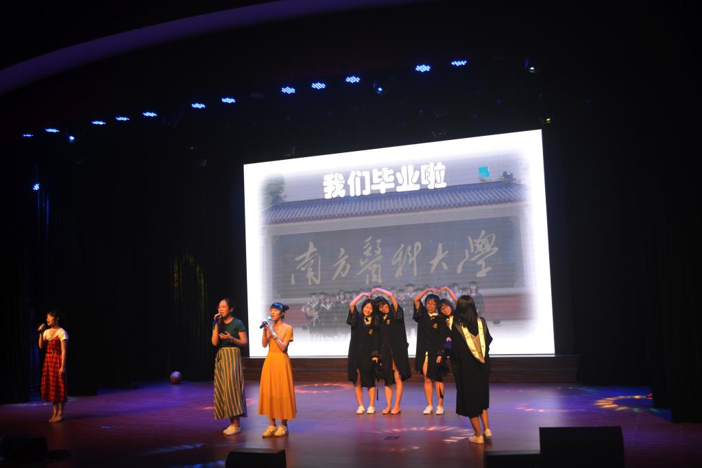 暖场游戏remember me拉开了晚会的帷幕。紧接着,青春洋溢的毕业生照片视频,呈现了毕业生的风采和美好的大学生活。歌曲《心愿》唤起了大家大学伊始时的初心。 “听歌识曲”的游戏活跃了晚会的气氛。主持人对同学的采访为独唱歌曲《广东爱情故事》进行了铺垫。实力唱将白静怡用歌声配合视频带大家走进了外星人的世界,感知未知宇宙的危险魅力。2017级多才多艺的高毓清同学,边弹边唱,用歌声和吉他演绎了《被雨困住的城市》。激昂炫酷的歌剧《Satisfied》点燃了现场观众的激情,情节跌宕起伏,吸引了全场的目光,带来晚会的高潮。迎合晚会“毕业”主题,娓娓道来的歌曲《遥远的歌》和《光阴的故事》缅怀了青春与旧时光。时间匆匆,五年的情谊弥足珍贵,合唱曲目《友谊天长地久》表达了同学们对友谊的期望。晚会接近尾声时,辅导员任婧为毕业生送上祝福。2013级毕业生合唱的改编曲目《南医小幸运》以及自制的毕业视频渲染了毕业氛围,为晚会画下了圆满的句号。