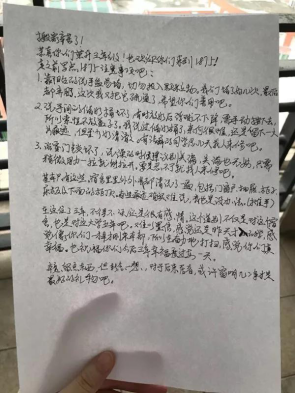 校本部高层公寓1875号宿舍的毕业生们离别前留下一封信,与即将搬入的同学隔空对话,带走记忆留下了温情。“对于后来居者或许窗明几净才是最好的礼物吧” “难以置信,感觉还是昨天入的学,感觉像你们一样才刚来本部,所以在奋力地打扫,感觉你们真幸福。也祝你们今后三年幸福度过每一天。”