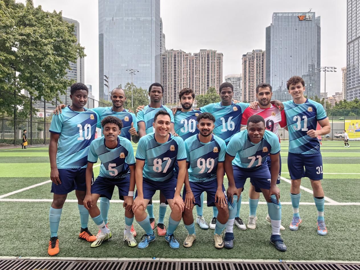 在足球赛场上,我校留学生队员们在激烈的比赛中展现出团结协作的精神。决赛中,运动员们沉着应对,在落后的局面下敢打敢拼,最终扳平比分,并在点球决战中赢得最终胜利,充分彰显了南医人的风范与智慧。