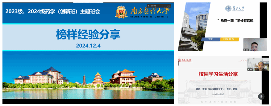 12 月 4 日,“榜样经验分享” 班会在线上举行,班主任邀请首届药学(创新班)毕业的上海优秀校友为同学们分享经验。上海交通大学覃盈详细介绍研究生学习生活及推免经验分享,复旦大学王堂分享了本科学习关键与考研诀窍,他们从入学讲到毕业,强调学习方法、科研与沟通能力的重要性,鼓励学弟学妹学们要坚定信心,不断开阔视野,持续努力向前。