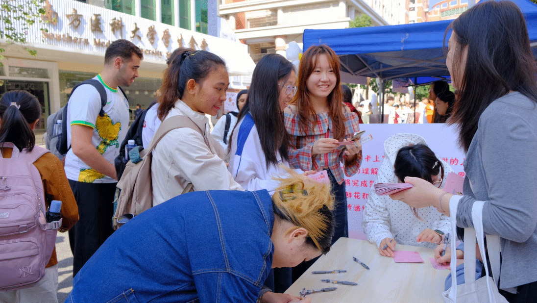 活动设计了一系列温馨互动与真诚表达途径,引导学生感受感恩的力量。环节之一为“纸短情长,感恩有你”,请同学们在定制卡片上写下自己关于感恩的话语和感悟,同学们纷纷参与并交换感恩卡片。另一个环节为“感恩真心话”,请同学们现场拨打电话给想要感谢的人,向他们表达感恩之情。不少同学借此契机鼓起勇气表达了深藏于内心的爱与感恩。与此同时,心理健康中心吉祥物“莲心仔”惊喜现身,给同学们献上温暖的拥抱,吸引了许多同学们合影留念。