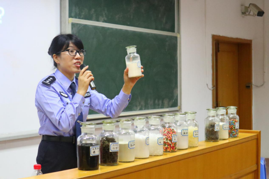 两位警官详尽系统地介绍了我国的《禁毒法》《出入境管理法》等法律法规,介绍了毒品的定义和种类、我国对毒品的管制规定以及对吸贩毒人员的惩处措施,同时还讲解了签证的种类和最新政策等内容。讲座中,两位警官展示了仿真毒品样品并教大家如何识别,帮助大家提高对存在于生活中的各种毒品的警惕性,以及毒品对个人、家庭及社会造成危害的认识;使学生们进一步加强了法律意识;给留学生提出的在华学习、生活的建议让他们感到受益匪浅。