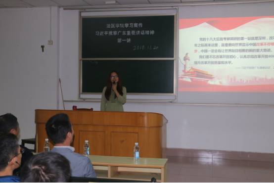 11月20日,法医学院组织专题会议,邀请学校理论讲师团成员、马克思主义学院博士党彦虹就学习习近平总书记视察广东重要讲话精神系列专题讲座开讲。会议由法医学院党委委员胡志刚主持,学院领导、在校师生近100人参加了学习。