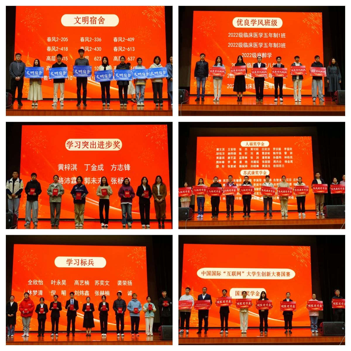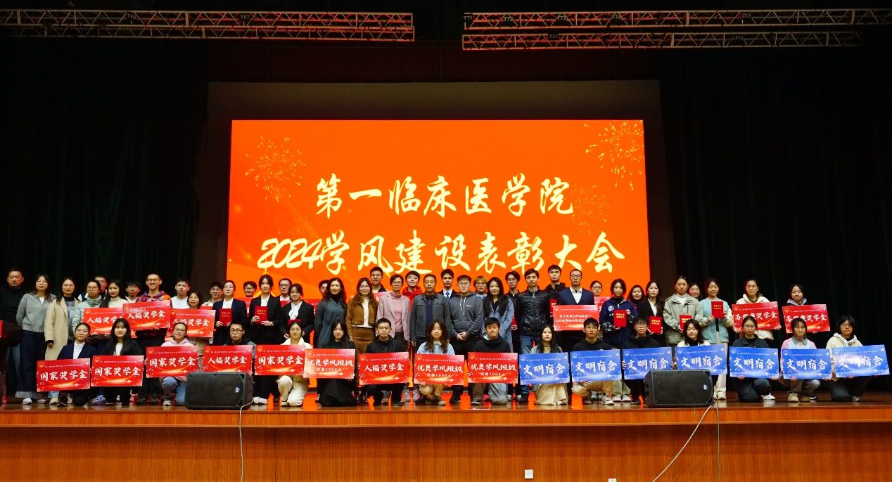 第一临床医学院在2024年从学生发展为中心的“两家两坊”在思想引领、心理服务、学业指导及职业规划四个方面开展了系列学风建设相关活动,也取得了优异成效。本次大会表彰了中国国际大学生创新大赛1金1银团队、陈嵘等80名国奖奖学金获得者、唐文淇等34名“人福”奖学金获得者、何煌等46名“苏武康”奖学金获得者、2022级临床医学五年制1班等6个优良学风班级、高艺楠等10名学习标兵、黄梓淇等6名学习进步突出奖、春风园2栋205等15个文明宿舍。