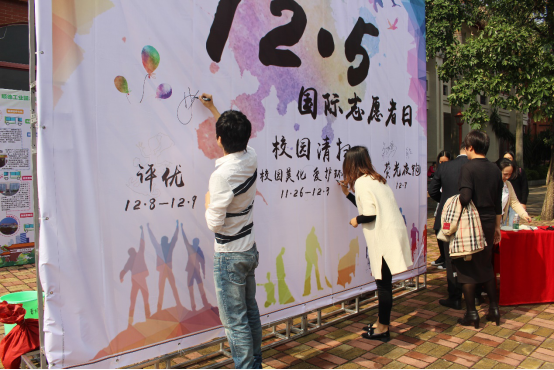 管委会蔡英为出征仪式致辞,她指出,通过清扫活动希望能够为大家营造干净美丽的学习生活环境,并帮助大家树立爱校园、爱清洁的优秀品质。此后,全体老师以及志愿者相继在活动幕布上签字。
