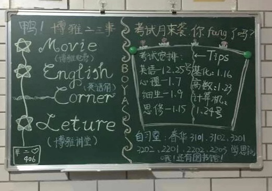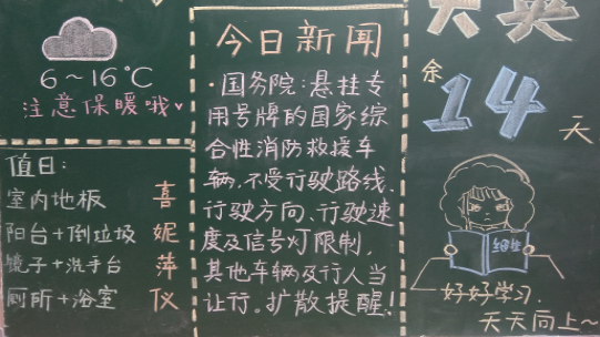 其中,有一个宿舍的黑板报,内容包括今日天气、今日新闻、距离下一场考试的时间等,版面规整,插画新颖鲜活,使人眼前一亮。