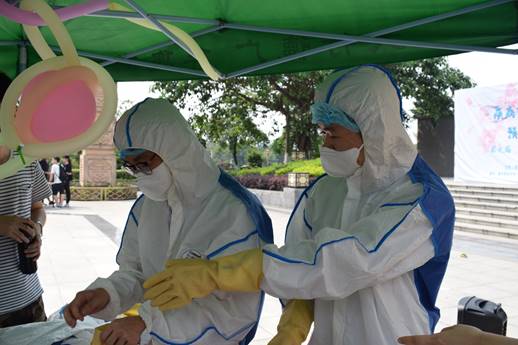 决赛当天,在文化广场,由主持人介绍规则之后,第九届疾病预防大赛拉开了帷幕。每一支队伍在找到自己的对手之后,开始对现场各个形式不一的摊位进行商讨,找寻对本组有利的比赛形式。同学们在各答题点大展身手,一举制胜。通过知识竞答、趣味游戏与实操演练三个项目,将理论知识与实际操作结合起来,争取尽快完成第一阶段的比赛。
