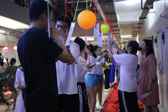 游园会现场挂上了各式各样精致小巧的灯笼,夹杂在灯笼之间的是一条条精心准备的灯谜。博雅学子们在灯谜丛中来回阅读字谜,细细思索,有的三五成群一同讨论,有的同学则是独自斟酌。陶味居里热闹非凡,猜对灯谜的同学比比皆是。他们拿着换取到的小月饼或者小糕点满意而归。