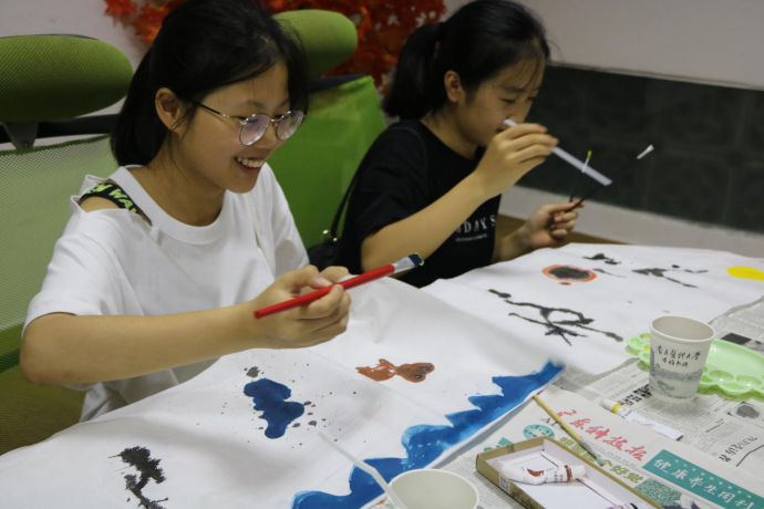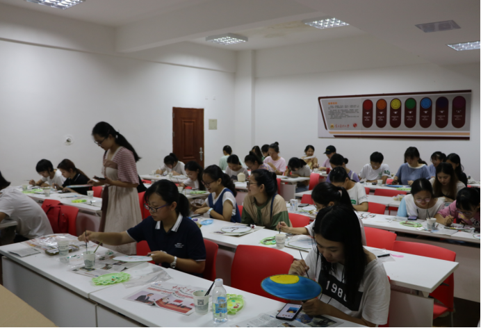 另一旁的学思阁内,“绘·中秋”活动也吸引了许多同学前来参与。同学们从工作人员处领取到画笔与团扇便开始作画。他们充分发挥自己的才华与想象力,有的同学在团扇上细细勾勒,用自己精妙的笔触绘出自己对中秋的愿景;有的同学的绘画风格则飘逸潇洒,大笔一挥,团扇上便展现出另外一种风采。同学们的绘画热情高涨,作品也各有特色。