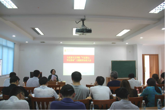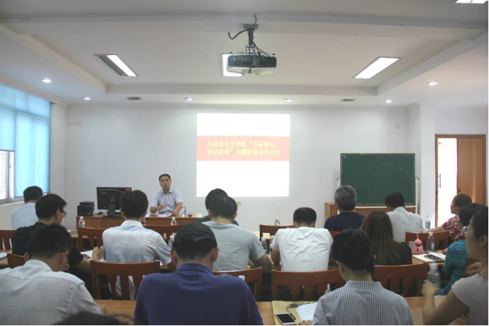 9月19日下午,马克思主义学院召开“不忘初心、牢记使命”主题教育动员大会,深入贯彻落实习近平总书记在“不忘初心、牢记使命”主题教育工作会议上的重要讲话精神,按照学校对主题教育的部署要求,对学院主题教育进行动员和部署。学院全体师生出席了会议,会议由副院长谢传仓主持。