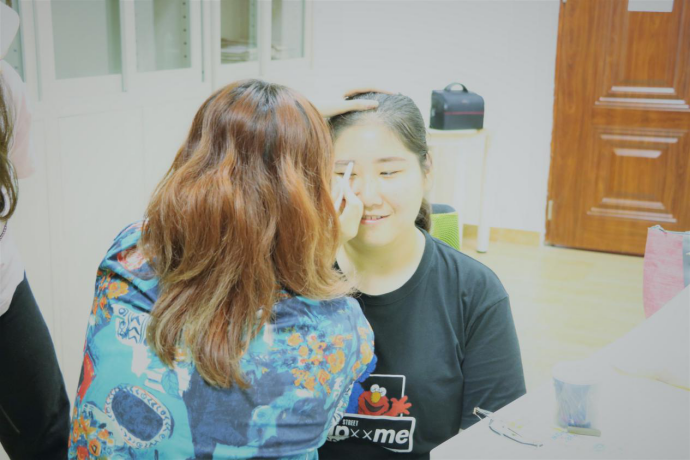 第二次课上,导师重点讲授眉部妆容和修容,她提醒大家,要通过扬长避短,突出脸部最美的部分,使其显得更加美丽动人;另一方面要掩盖缺陷或矫正不足的地方,切记要注意妆容的自然协调,不留痕迹,根据个人特色避免“千人一妆”。在化妆前,导师为现场化妆学员进行了专门设计,强调个性特点。她还强调:“不要单纯模仿,化妆时不可片面追求速度,敷衍了事,而是要采取一丝不敬的态度,有层次、有步骤地进行,化妆时动作要轻稳,注意选择合适的色彩和光线,适合自己的才是让人看着最舒服的。此外在平时化妆还要与发型、服装和饰物相配合,力求达到整体完美的效果。”