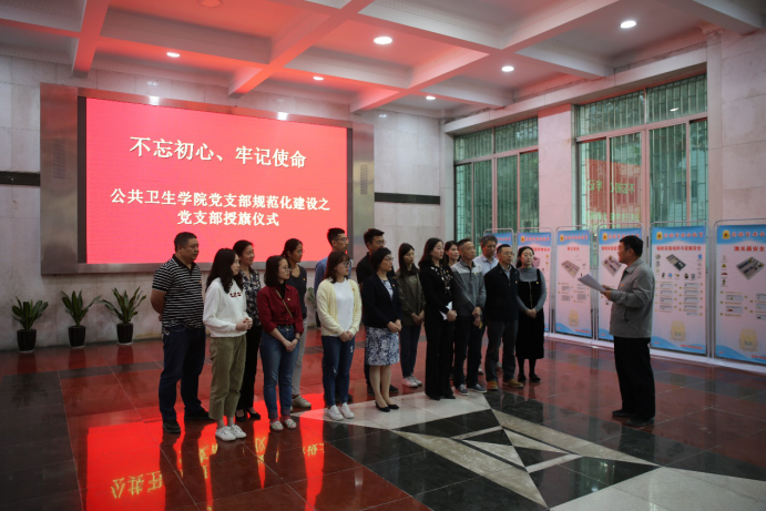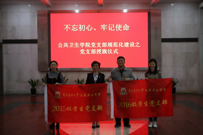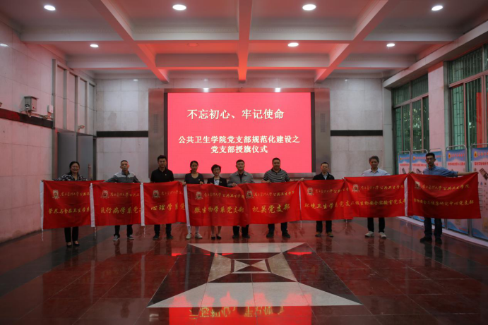 “不忘初心,牢记使命”主题教育开展以来,公共卫生学院党委创新教育模式,推行党支部规范化建设:统一党建工作PPT模板、统一主题教育相关文件格式,本次党支部授旗仪式也是规范化建设的其中一项任务。