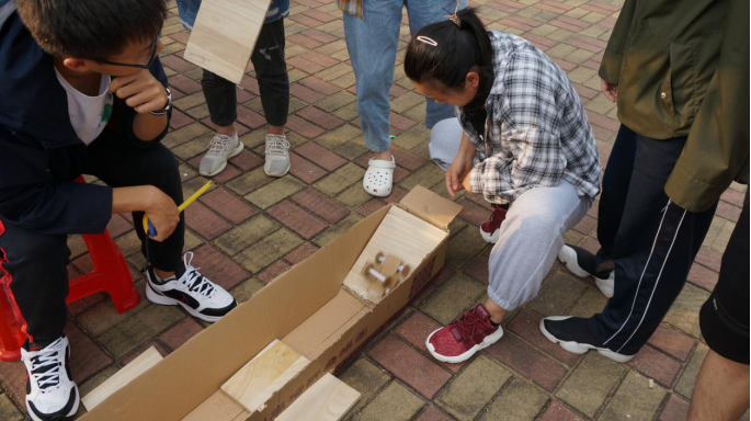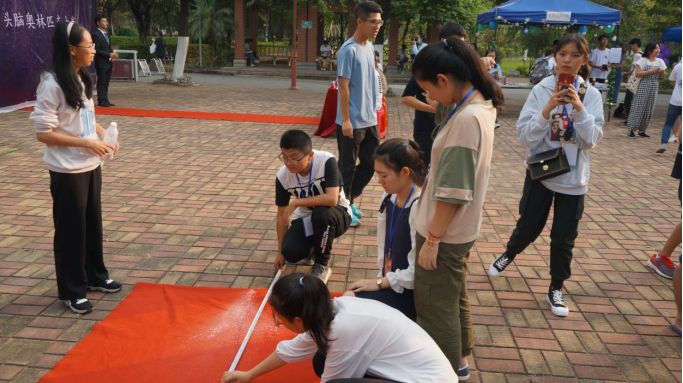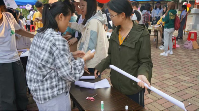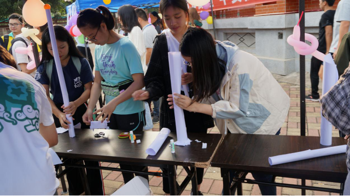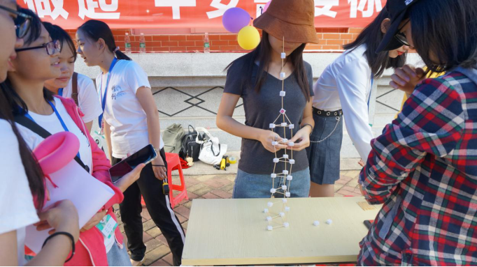 短期项目的难度与趣味不输长期项目,反而更考验个人与团队的配合及临场发挥的能力:橡皮与牙签这两件风马牛不相及的东西会发生什么样的化学反应?乒乓球怎么样能像日出一样冉冉升起?一张A4纸如何化身悬臂?现场还有“塑料球保龄球”“水分子别跑”“九宫幻卡”等观众小游戏,引得路过的同学都驻足观看、积极参加,比赛的气氛更加欢快。