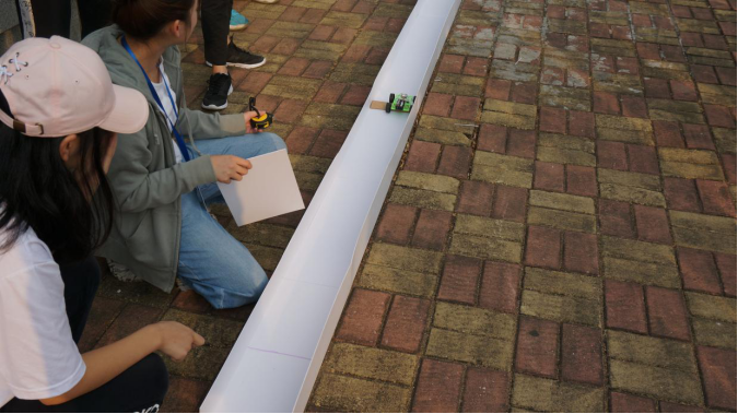 竞赛项目分为长期项目和短期项目。长期项目要求每个队伍提前完成,带作品到现场展示比拼。同为纸制的小车展示出不同的光彩:有的小车参加了“动力战车PK大赛”在赛道上大放异彩,有的小车参加了“惯性小车”从斜坡滑下,再次出发。赛场上上演着速度与激情,“灭火英雄”仿照干粉灭火器原理制作的灭火器不但没有浇灭创意,反而更助燃了同学们的热情。