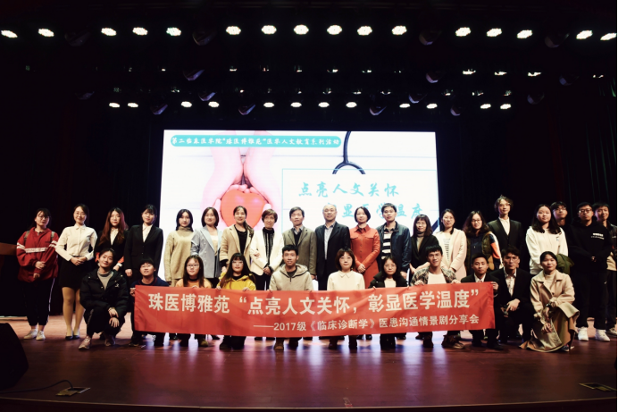 12月9日晚,第二临床医学院珠医博雅苑于文化活动中心举办了以“点亮人文关怀,彰显医学温度”为主题的2017级《临床诊断学》医患沟通情景剧分享会。活动邀请了公卫学院副院长万成松、基础医学院病生教研室教授黄巧冰、珠江医院心血管内科副主任吴宏超、消化科主任王新颖及呼吸科医生吴锡平等专家为嘉宾。2017级临床医学、儿科、精神病学专业420名学生参加了活动。