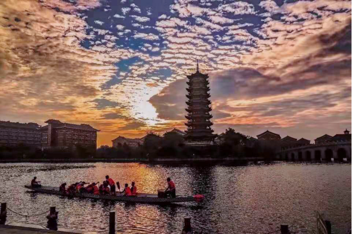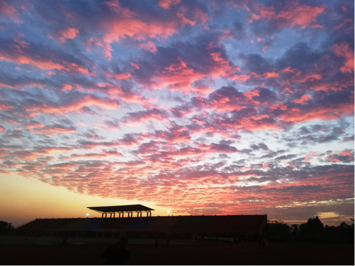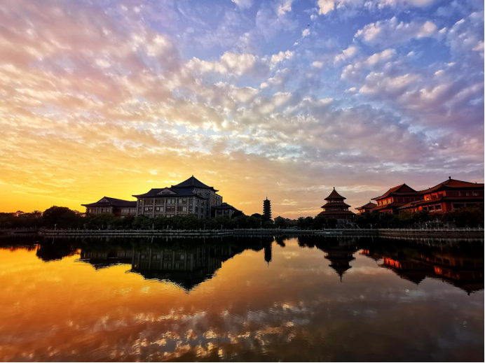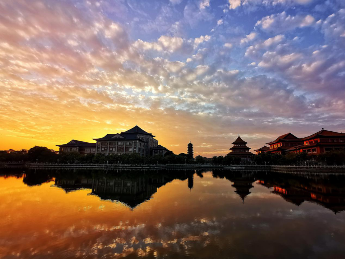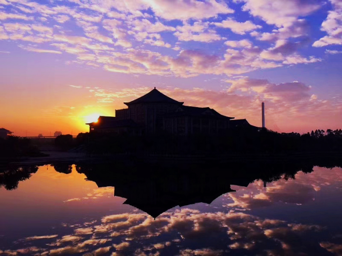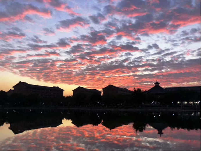 在顺德校区,冬季的晚霞特别璀璨,用绚丽来形容它的瞬间万变以及它的色彩艳丽仍不足以为实。老师和同学们刚刚还在教室,下课一步出教室,顺眼间那傍晚的天空,四面不同的云彩会变魔术似的迎面扑来,其壮丽的走势有如百鸟穿空,更似波涛汹涌,滚滚而来。在天空与校园内特定的景湖环境下,显得特别惊奇,且不可思议。跃的云空展示着祥瑞,呈现出清新爽快,和谐舒宜的顺德校区环境。
