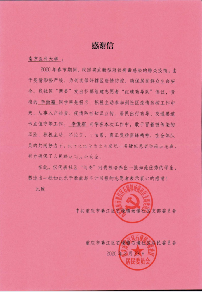 李傲霜敢于冒着被传染的风险,不怕苦、不怕累、甘于奉献的雷锋精神,得到了当地党支部与社区委员会的认可与肯定,并给我校发来表扬信。在得知表扬信后,李傲霜表示只是尽了一名青年和南医学生该尽的责任,在这次志愿服务过程中,自己感触和收获良多,希望今后踏入社会后,更加努力,为国家和社会奉献更大的力量。