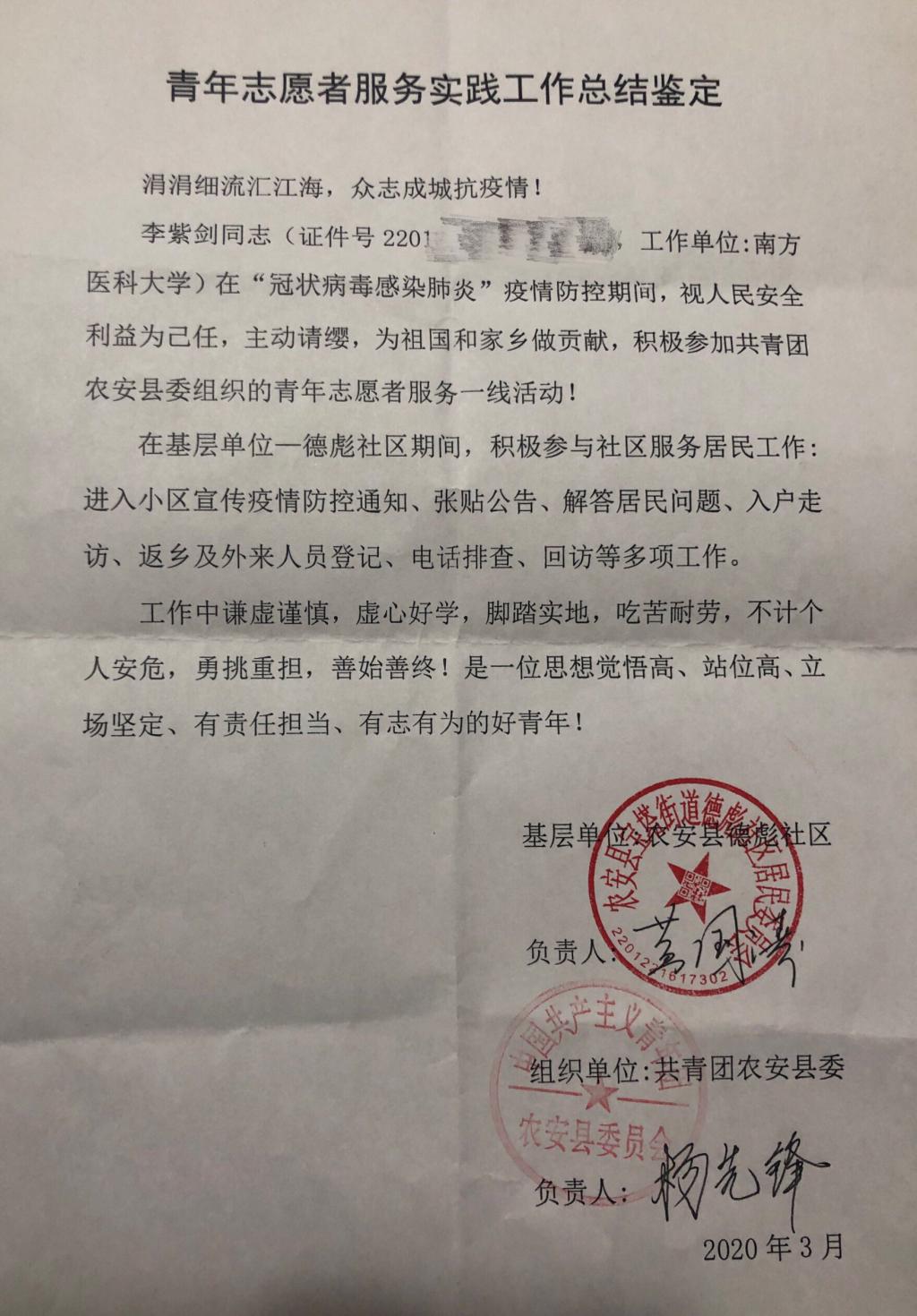 志愿工作结束后,我收获颇丰,不仅荣获“优秀志愿者称号”,还大致了解了基层防疫工作的运作体系、家乡人民疫情期间的生活状态和社区基层工作者在推进各项基层工作时的艰辛,这些于我而言都十分珍贵。