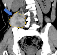 图1 术前CT:黄色虚线边框示硬纤维瘤大小