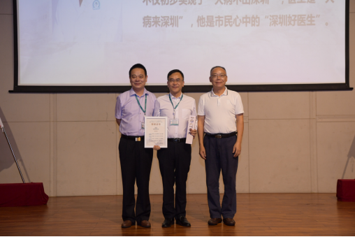 (肖烈辉书记和廖四照院长为“深圳好医生”刘亚杰副院长颁奖)