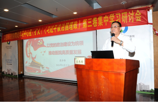 熊梦辉提出了四点要求:一是要提高政治站位,深化思想认识;二是要强化学习宣传,营造浓厚的氛围;三是要践行“两个维护”,精准对标对表;四是要学思践悟强信心,凝心聚力谋发展。他具体指出,要通过《习近平谈治国理政》第三卷的学习,提高个人觉悟境界,把学习成效落实到医院的发展上,进一步加快盘福院区建设和“三甲”申报等工作的进度,补齐医院在科研、教学、人才等方面的短板,促进医院更快更好地发展。
