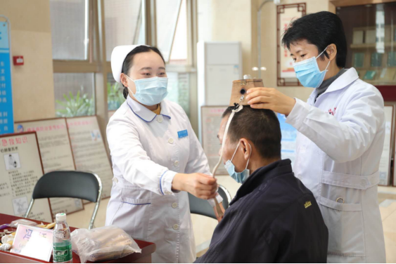 患者巫先生56岁,头晕头痛一月余,心血管科护理单元护师、广东省中医专科护士冯娇给予艾灸百会以醒脑开窍,平肝潜阳;耳穴压豆以通络止痛,活血理气化瘀。活动现场中医氛围浓郁,群众切身体验到中医药治疗的简便验廉。