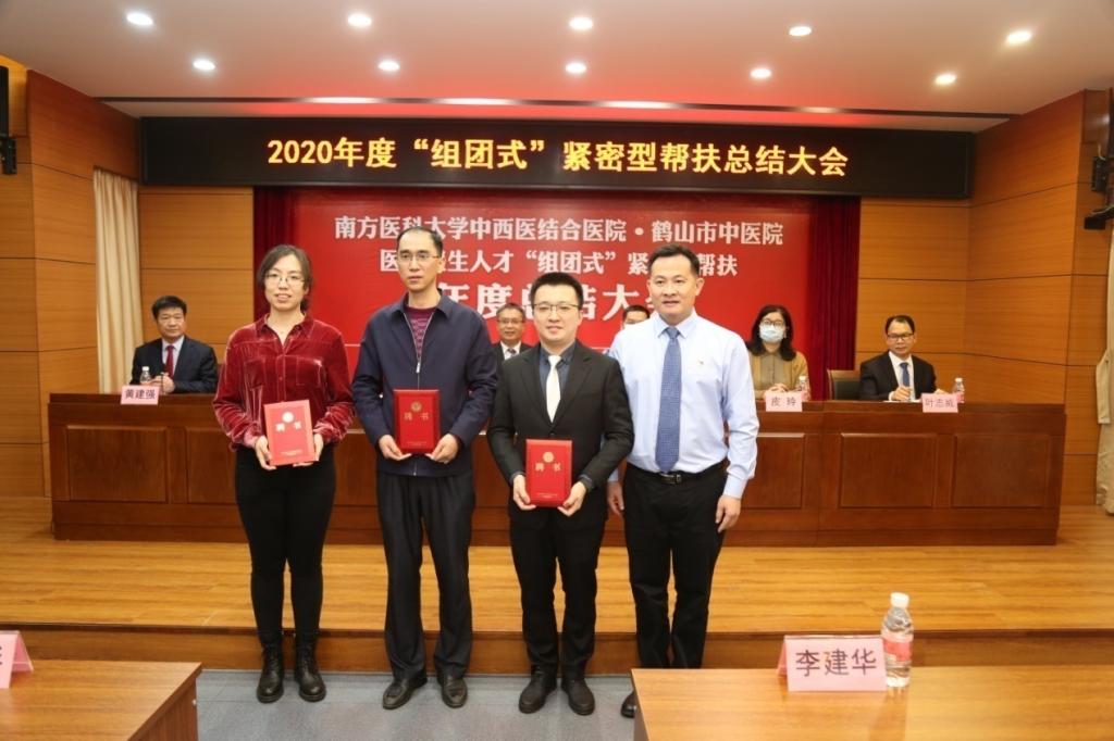 为了更好地开展第二年的帮扶工作,应鹤山市中医院的恳切要求,黄建强副主任还将留任两个月并继续担任帮扶团队队长,钟东博士、田新发医生继续留下帮扶。另根据鹤山市中医院实际工作需要,中西医结合医院另派出肾病科陈杰彬、肿瘤中心翁勰、重症医学科蔡佳辰3位骨干人才作为第二批帮扶队队员。会上,源孔云为中西医结合医院帮扶专家颁发了帮扶先进个人荣誉证书,吕世权为新一轮帮扶人员颁发聘用证书。