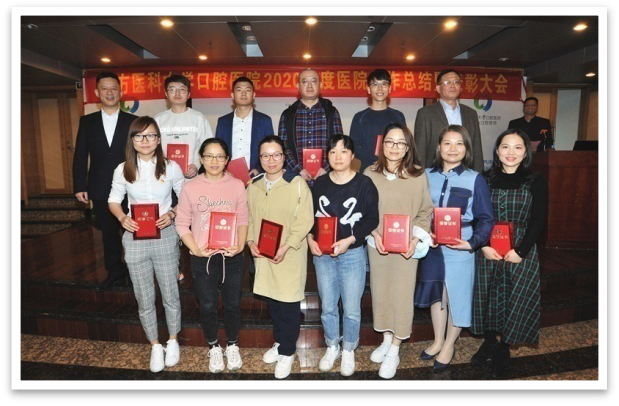 为进一步激励全院教职工担当作为,推动医院工作再上新台阶,2月5日,口腔医院召开2020年工作总结暨表彰大会,总结回顾过去一年医院各项工作,安排部署2021年重点工作任务,并对成绩突出的先进集体和个人进行表彰。会议由医院党委书记莫乔锋主持,医院领导班子成员,党支部书记、副书记、支部委员,行政科室负责人,临床、医技科室负责人、护士长等约120人出席会议,番禺院区和海珠广场院区同步召开视频会议。