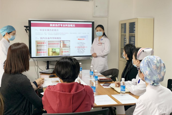 随后,内科片总护士长朱艳对珠江医院护理概况及近几年的专科护理发展展开介绍。放疗科护士长李菀丹从放疗科护理队伍的建设、病房管理、护理质量、护理教学、护理循证与科研等方面进行了介绍,带领南医五院护理同行参观了放疗科病房、放疗日间病房、放疗定位室及机房,并介绍了放疗科的护理专科特色,癌因性疲乏的管理、营养、无呕、无痛病房的建设、静脉输液管理等。