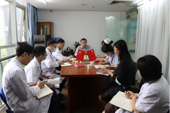 许明辉指出,党史教育与优质服务相结合,科室要在推进党建与业务工作深度融合中提质聚力。他希望科室做到三个“用心”:一是用心学,科室发展存在许多问题和困难,突出重围要善于专研学习,对内深挖潜力,对外借鉴学习,不断提高科室业务水平和竞争力;二是用心做,优质服务提升要注重服务细节,优化服务流程,提升服务质量,切切实实为群众办实事、办好事;三是用心想,善谋划,瞄准定位,把眼光放长远,考虑学科未来几年的发展方向,做好规划。蔡道章院长表示,要坚定不移以习近平新时代中国特色社会主义思想为指导,以做大业务量为中心,努力提高手术效率,全面提升各学科综合实力,努力构建优质高效的医疗服务体系。要着力破除制约医院高质量发展的体质机制障碍,提升服务质量,形成诊疗更加安全、就诊更加便利、沟通更加有效、体验更加舒适的服务新模式,统筹推进医教研协同发展,推进医院建设发展迈向新台阶。
