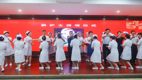 院领导及护理部主任陈小芳上台为新护士授帽。授帽仪式后,护理部主任陈小芳带领护士们重温了南丁格尔誓言。