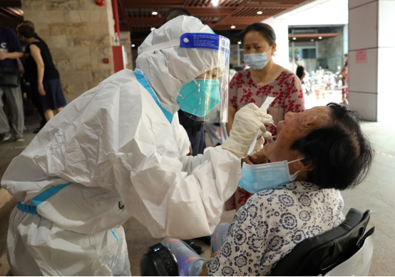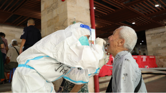 医护队伍到社区来,免去了群众的反复奔波,在医护队伍到达前,现场已排起了近百米的队伍。“不用我走上去,我站不了的。很感动,现在我们大中国真是让我们老百姓感动。”在社区,有较多行走不便的老人家坐着轮椅前来配合核酸采样工作。由于核酸采样点前有数级阶梯,为了让老人家少走动,医护人员就走下来为他们进行核酸采样。
