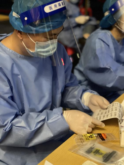 抵达采集点的时候,上一批的同事已经奋斗了十几个小时,不少人都累得在角落里睡着了。杨医生夫妇和其他同事们一起拿起接力棒,继续开展核酸检测采集工作。