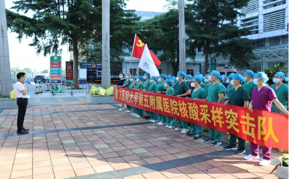 6月6日,第五附属医院接到上级通知,要组建一支“核酸采样突击队”奔赴太平镇,发出倡议后,迅速集结了一支50人的队伍。早上6点多培训后,正式奔赴“战场”。突击队中,党员干部居多,充分发挥了党员的先锋模范作用。