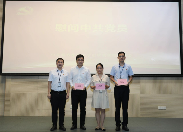 随后,医院党委书记陈旭坚对李畅畅、陈磊、王维佳三位同志进行集体慰问,为他们发放慰问金并合影留念。