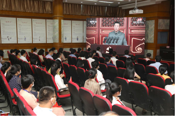 在学术会议厅观看现场,党员胸前佩戴鲜红的党徽,手持国旗,集中收看直播盛况,聚精会神聆听习近平总书记在庆祝中国共产党成立100周年大会上的重要讲话,共同见证举世瞩目的历史时刻。