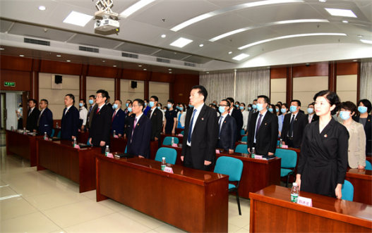 党课结束,与会人员全体起立,挥舞手中旗帜,齐声高唱《没有共产党就没有新中国》。医院庆祝建党100周年暨“七一”表彰大会在歌声中圆满结束。