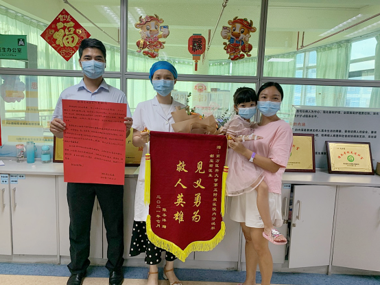 时间一分一秒的过去,经过郝宝珺专业、耐心的救治,女童的嘴唇慢慢由紫色转为红润,呼吸、心跳也逐渐恢复正常。为了以防万一,女童又被120救护车送到五附院进一步救治。郝宝珺向120随车医护人员详细描述当时的场景,告知他们女童的状况,直到一切安排妥当,她才放心的离开现场。后来,经过医院积极救治,患儿的身体正在慢慢恢复。