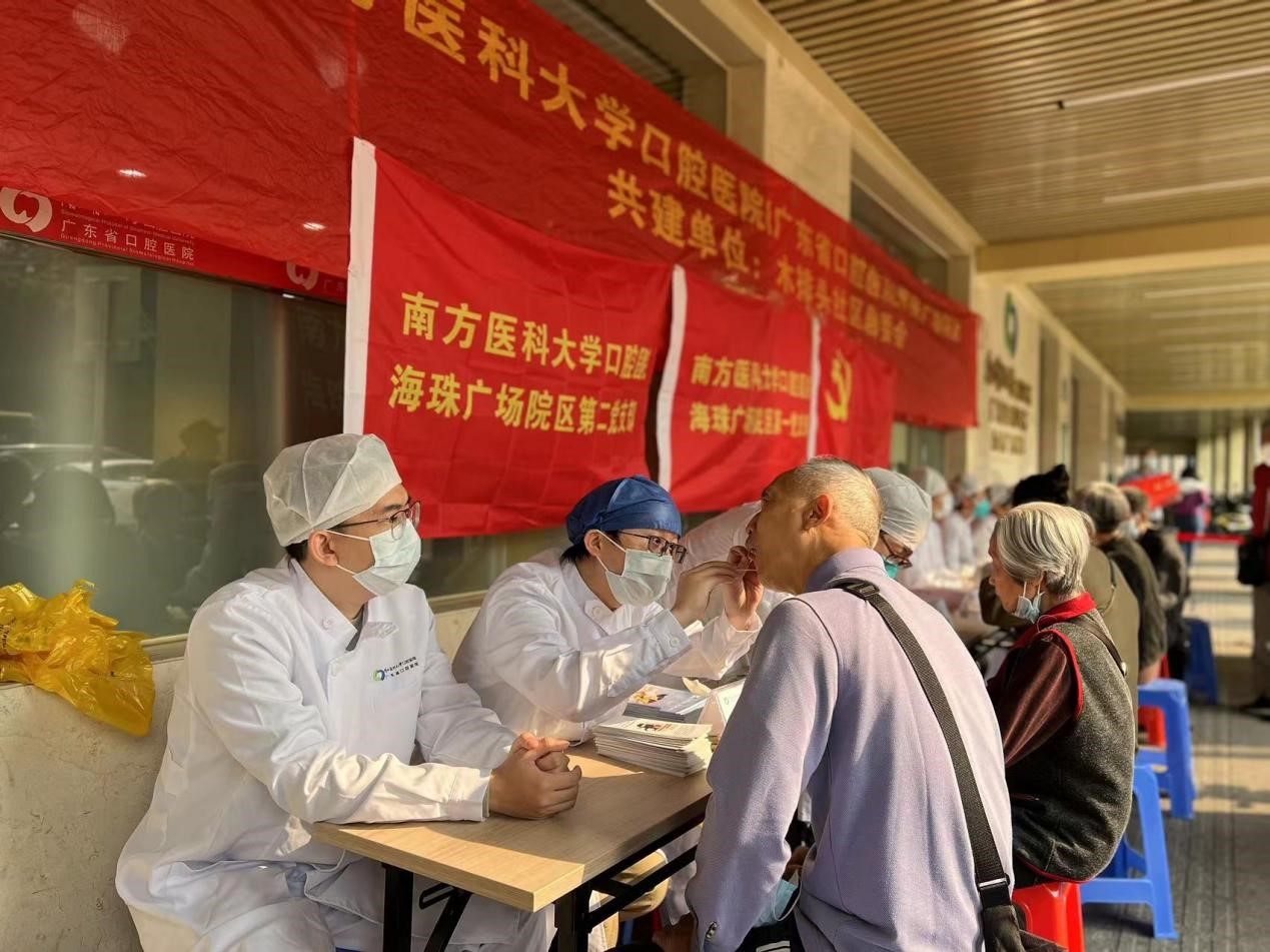 口腔医院海珠广场院区联合木排头社区居委会,在海珠广场院区门口为周边社区居民进行免费义诊。海珠广场院区的8个临床科室,三个党支部均派出临床经验丰富的资深医生为群众解答口腔问题。