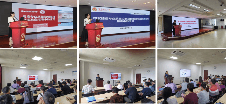 南方医院放疗科副主任官键教授介绍了头颈肿瘤流行病学、鼻咽癌局部侵袭特点、多学科团队(MDT)与全程支持管理的重要性以及靶区勾画相关内容。王玮教授详细介绍了食管癌十项质量控制指标解读及在指南中的应用,丁轶教授结合2023年NCCN《肿瘤临床实践指南:胃癌》、“2023年CSCO《胃癌诊疗指南》以及2021年日本《胃癌治疗指南》第6版”,介绍了十一项胃癌专业质量控制指标胃癌、十二项结直肠癌专业质量控制指标、胃癌、结直肠癌TNM分期、晚期疗效评价以及个体化方案精确治疗。谢国柱教授详细介绍了十项前列腺癌专业质量控制指标、陈蓓副教授针对头颈鳞癌,详细讲述了TNM分期诊断率、病理诊断率、术后辅助放疗率、术后同期放化疗率以及同步化疗采用标准方案率。莅临我院培训的专家还有来自南方医院的王宏梅博士、董忠谊博士、白雪博士、张余琴博士、王剑博士,分别对乳腺癌、肺癌、甲状腺癌、肝癌、肾癌、宫颈癌质量控制指标进行了专业解读。