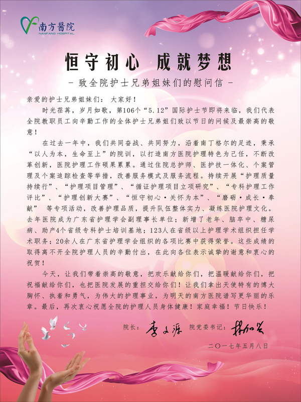 为纪念“5·12”国际护士节,传承南丁格尔精神,秉承“以人为本,生命至上”的院训,彰显南医护理特色,打造南医护理品牌,南方医院在“5·12”护士节期间开展了“十个一”系列纪念活动,包括一封院领导慰问信、一次护士评估技能大赛、一场以“成长·荣耀”为主题的护士节庆祝大会、一期“护理项目管理”启动、年度“循证护理实践”项目启动、年度住院总护师经验分享会、“医护技一体化”成果分享、年度“优秀护士”评选、年度“护理服务之星”评选、年度“磨砺·成长·奉献”主题演出等。