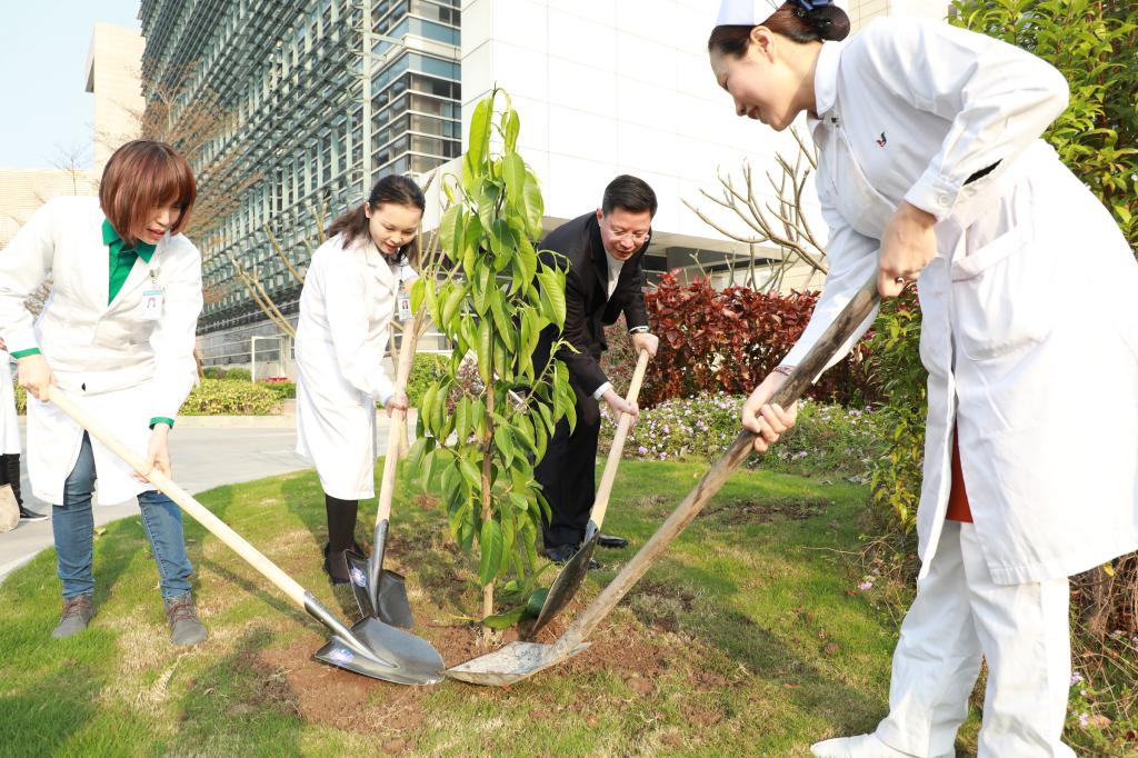 医院党委书记、院长刘瑞林与优秀医生代表李国华、优秀护士代表陈瑞芳、省重点专科代表卢剑华等,一起将一棵白玉兰树苗放入1号树坑,并一起将树苗扶直、用铁锹将土填平。刘瑞林表示,今天种植的是希望,来年收获的是成长,希望全体员工,借新医院全面启用的契机,一起推动医院各项事业再上新台阶。