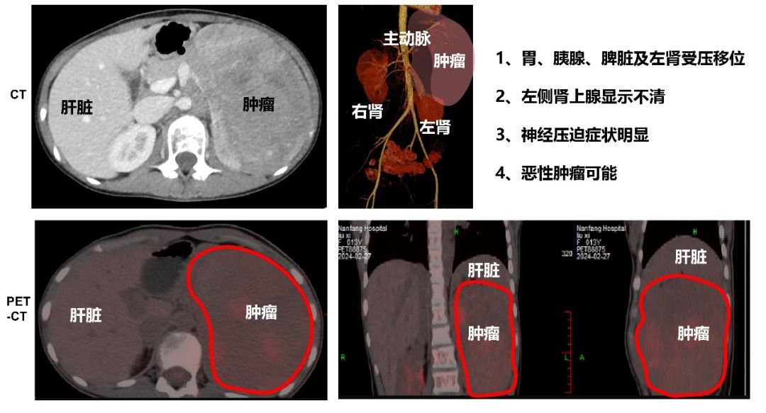 乐乐入院后,在治疗组缜密的计划和安排下,迅速完善了相关检查及鉴别诊断,评估也进一步证实:腹膜后间叶源性恶性肿瘤(最大径达15cm),且占据其大部分的左侧腹部区域,并影响到邻近左肾、脾脏、胰腺及胃等器官,神经母细胞瘤的可能性较大;同时,腹主动脉左旁及前方见多发淋巴结增大,代谢轻度增高,考虑为多发淋巴结转移灶。