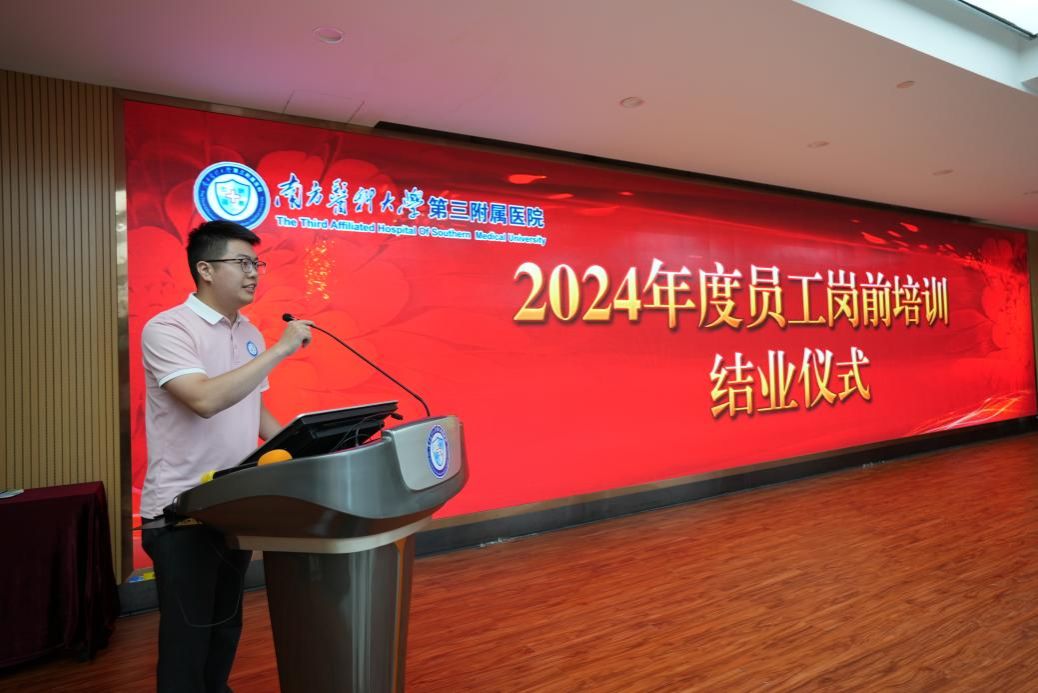 7月19日上午,医院举行2024年度新员工岗前培训结业仪式。在观看岗前培训总结视频后,新员工代表邓增发在仪式上发言,分享岗前培训的心得感悟与未来愿景。他表示,今后将以三院主人翁的姿态积极投身到医疗卫生工作中,展现青年才俊的蓬勃朝气与远大抱负。