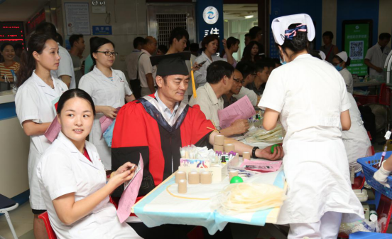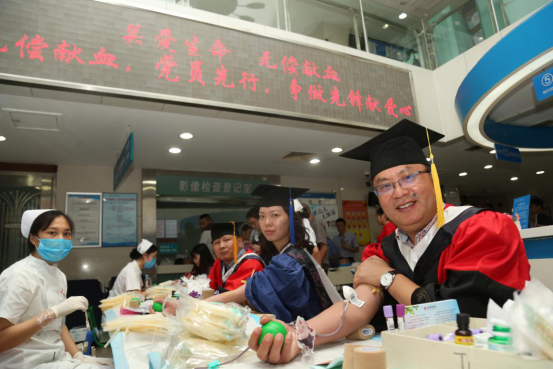 献血活动中,院长李爱民及其他几名导师特意身着导师服,带领学生参加献血,李爱民说,当医生要有大爱之心,现在是研究生的毕业季了,以这种方式给学生上最后一课,是希望给他们留下较深的印象,让爱心永远传承下去。身穿博士服参加献血的研究生罗越动情地说,“老师们不但在术业上值得我们学习,他们的仁爱之心同样值得我们学习和传承”。